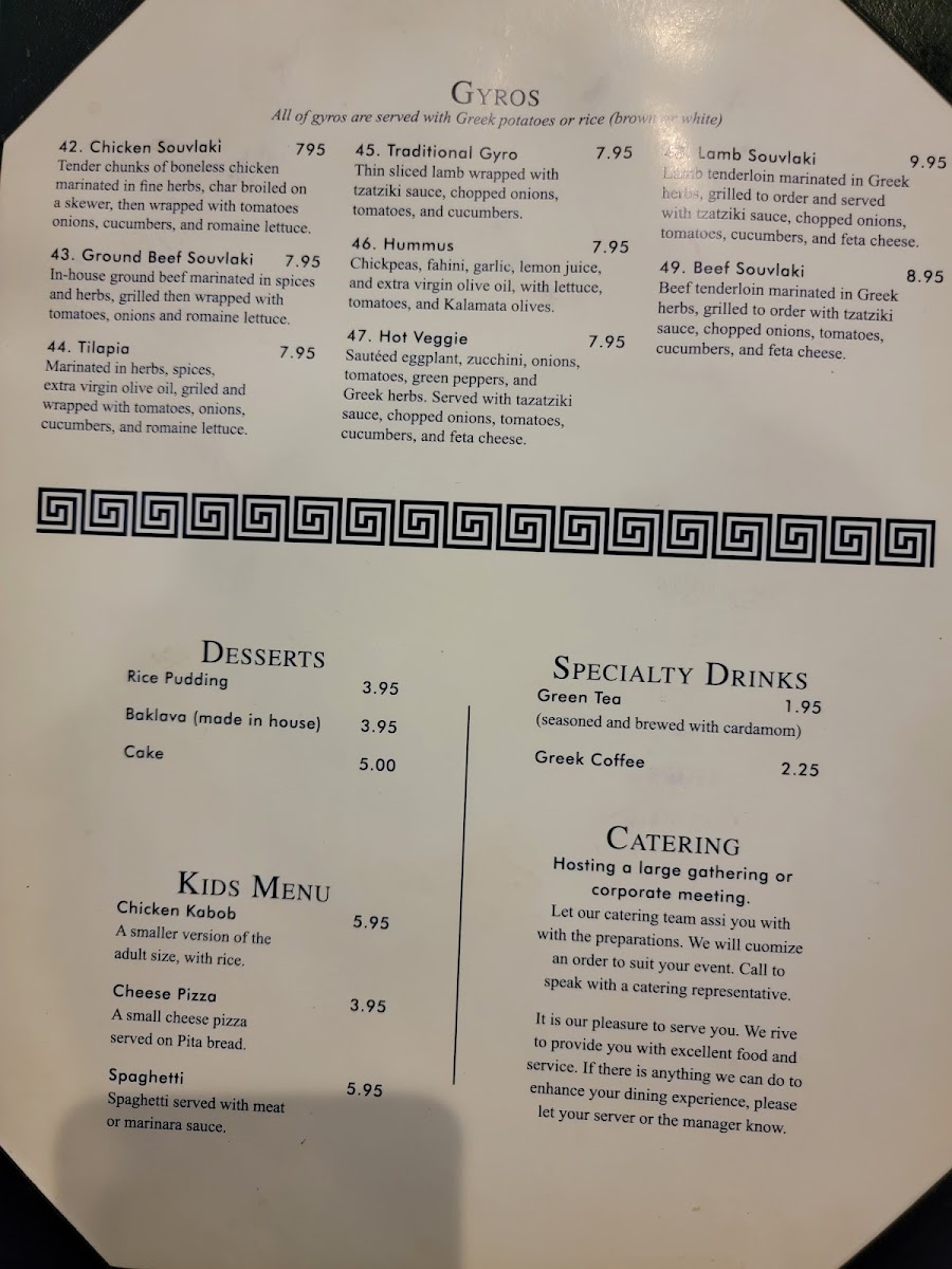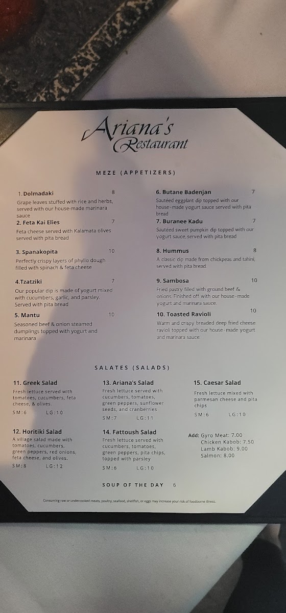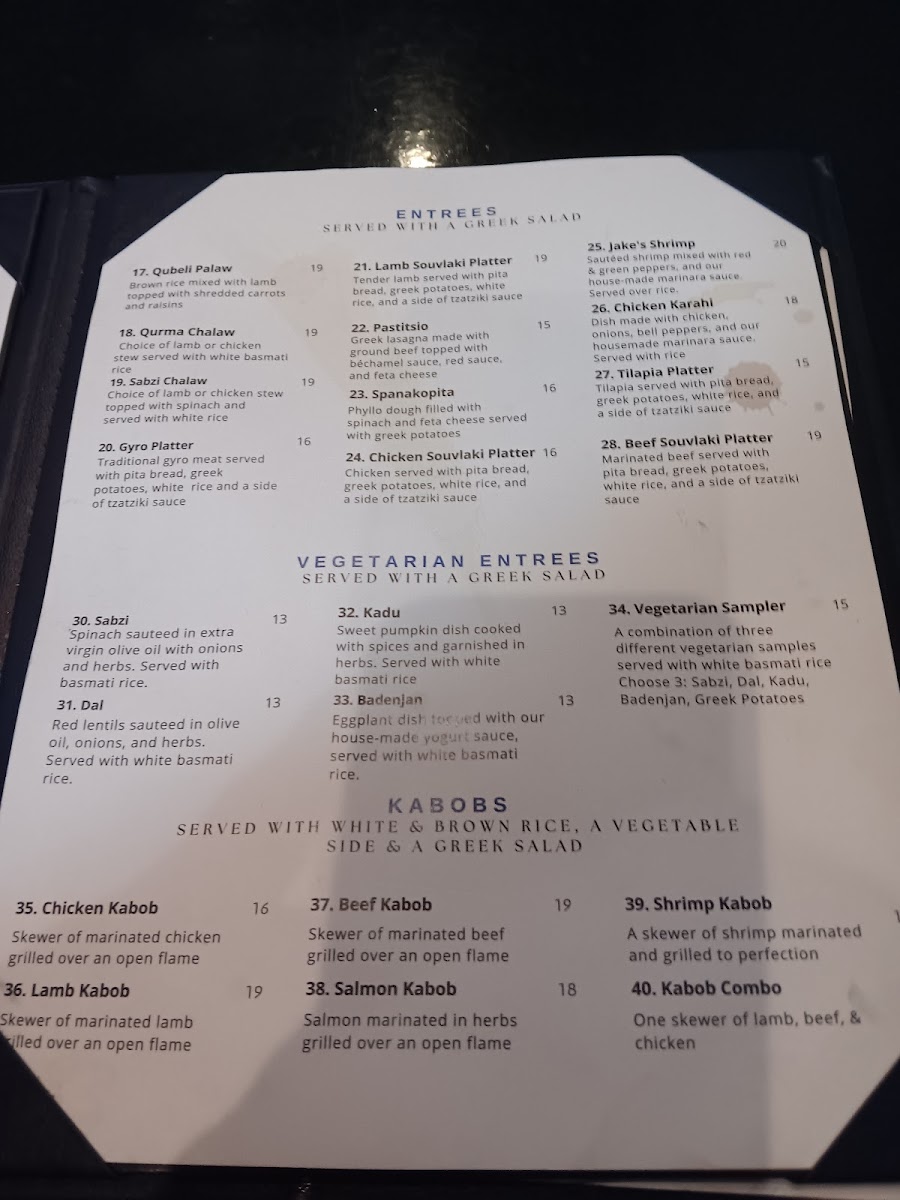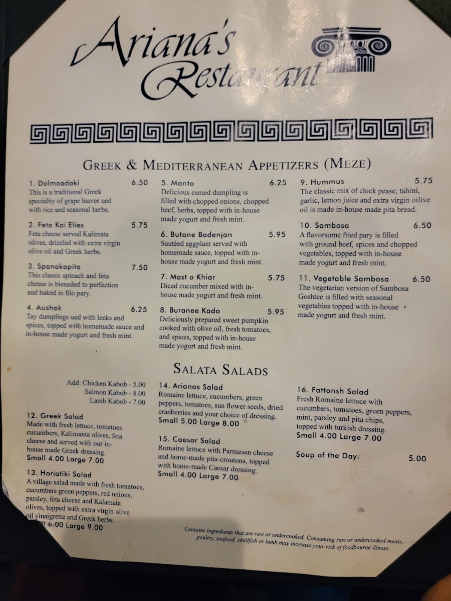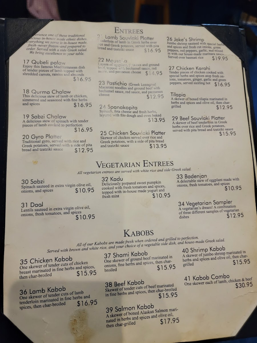 From a reviewer’s perspective, the menu at Ariana's Greek Restaurant feels like a thoughtful summary of Greek and Mediterranean comfort food, balancing familiarity with variety. As a conclusion to the menu experience, what stands out most is how well the offerings are structured to suit different tastes and occasions. The Sides such as White Rice, Badenjan (Side), Sabzi (Side), Greek Potatoes, and Dal (Side) work as simple but essential companions, while the Salads-including Horiatiki Salad, Greek Salad, Fattonsh Salad, Caesar Salad, and Ariana’s Salad-bring freshness and contrast to heartier dishes. The grill-focused Kabobs like Lamb Kabob, Kabob Combo, Beef Kabob, Shrimp Kabob, and Salmon Kabob clearly anchor the menu, offering protein-forward choices that feel both traditional and satisfying. Moving into mains, the Entrées such as Sabzi Chalaw, Chicken Souvlaki Platter, Beef Souvlaki Platter, Pastichio (Greek Lasagna), and Jake’s Shrimp highlight the restaurant’s Mediterranean identity, while the Gyros-from Traditional Gyro and Hot Veggie Gyro to Hummus Gyro, Beef Souvlaki Gyro, and Chicken Souvlaki Gyro-add a casual, handheld appeal. I also appreciate the range of Greek and Mediterranean Appetizers like Sambosa, Dolmadakia, Buranee Kadu, Buranee Bandenjan, and Hummus, which set the tone for sharing. For plant-based diners, the Vegetarian Entrées including Sabzi, Dal, Kadu, Vegetarian Sampler, and Badenjan feel genuinely considered rather than an afterthought. The menu rounds out nicely with Desserts such as Baklava and Chocolate Cake, simple Drinks like Unsweet Tea, Sweet Tea, and Coke, and family-friendly Kid’s Mains including Kid’s Pita Pizza and Kid’s Chicken Kabob. Overall, this menu reads as complete and cohesive, making Ariana’s a dependable spot for anyone craving Greek and Mediterranean flavors in West Columbia.
