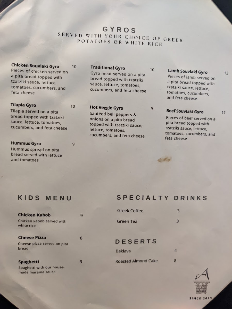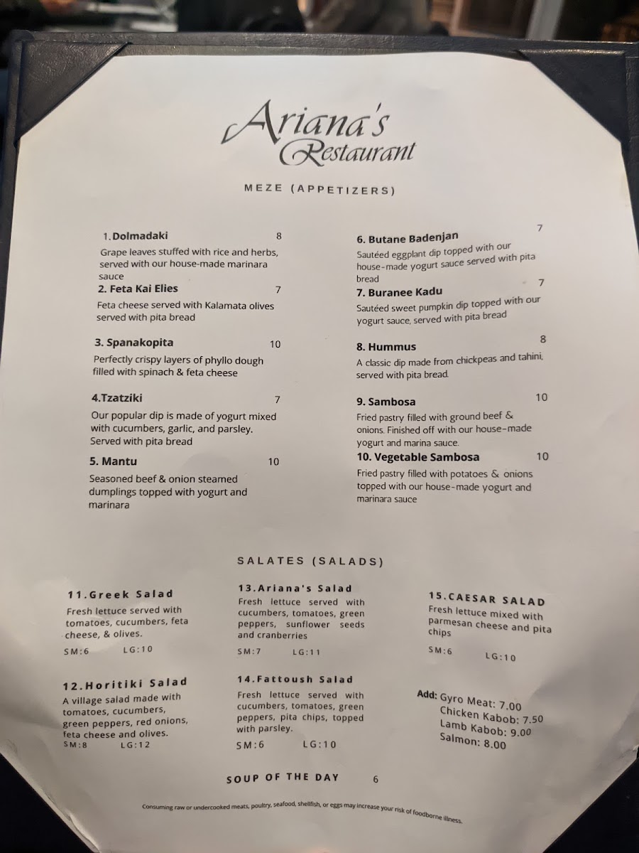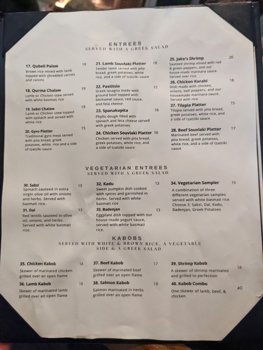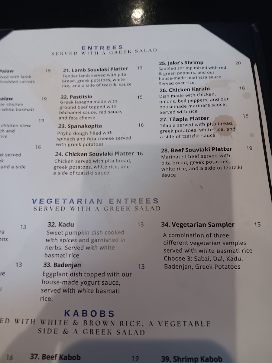 From a reviewer’s perspective, the menu at Ariana's Greek Restaurant feels like a thoughtful summary of Greek and Mediterranean comfort food, balancing familiarity with variety. As a conclusion to the menu experience, what stands out most is how well the offerings are structured to suit different tastes and occasions. The Sides such as White Rice, Badenjan (Side), Sabzi (Side), Greek Potatoes, and Dal (Side) work as simple but essential companions, while the Salads-including Horiatiki Salad, Greek Salad, Fattonsh Salad, Caesar Salad, and Ariana’s Salad-bring freshness and contrast to heartier dishes. The grill-focused Kabobs like Lamb Kabob, Kabob Combo, Beef Kabob, Shrimp Kabob, and Salmon Kabob clearly anchor the menu, offering protein-forward choices that feel both traditional and satisfying. Moving into mains, the Entrées such as Sabzi Chalaw, Chicken Souvlaki Platter, Beef Souvlaki Platter, Pastichio (Greek Lasagna), and Jake’s Shrimp highlight the restaurant’s Mediterranean identity, while the Gyros-from Traditional Gyro and Hot Veggie Gyro to Hummus Gyro, Beef Souvlaki Gyro, and Chicken Souvlaki Gyro-add a casual, handheld appeal. I also appreciate the range of Greek and Mediterranean Appetizers like Sambosa, Dolmadakia, Buranee Kadu, Buranee Bandenjan, and Hummus, which set the tone for sharing. For plant-based diners, the Vegetarian Entrées including Sabzi, Dal, Kadu, Vegetarian Sampler, and Badenjan feel genuinely considered rather than an afterthought. The menu rounds out nicely with Desserts such as Baklava and Chocolate Cake, simple Drinks like Unsweet Tea, Sweet Tea, and Coke, and family-friendly Kid’s Mains including Kid’s Pita Pizza and Kid’s Chicken Kabob. Overall, this menu reads as complete and cohesive, making Ariana’s a dependable spot for anyone craving Greek and Mediterranean flavors in West Columbia.